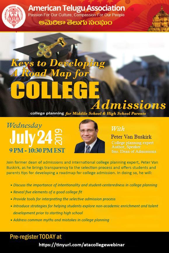 Join American Telugu Association and Peter Van Buskirk, College Planning expert, Author & Speaker as they bring transparency to the selection process and offer students and parents tips for developing a roadmap for college admission. In doing so they will